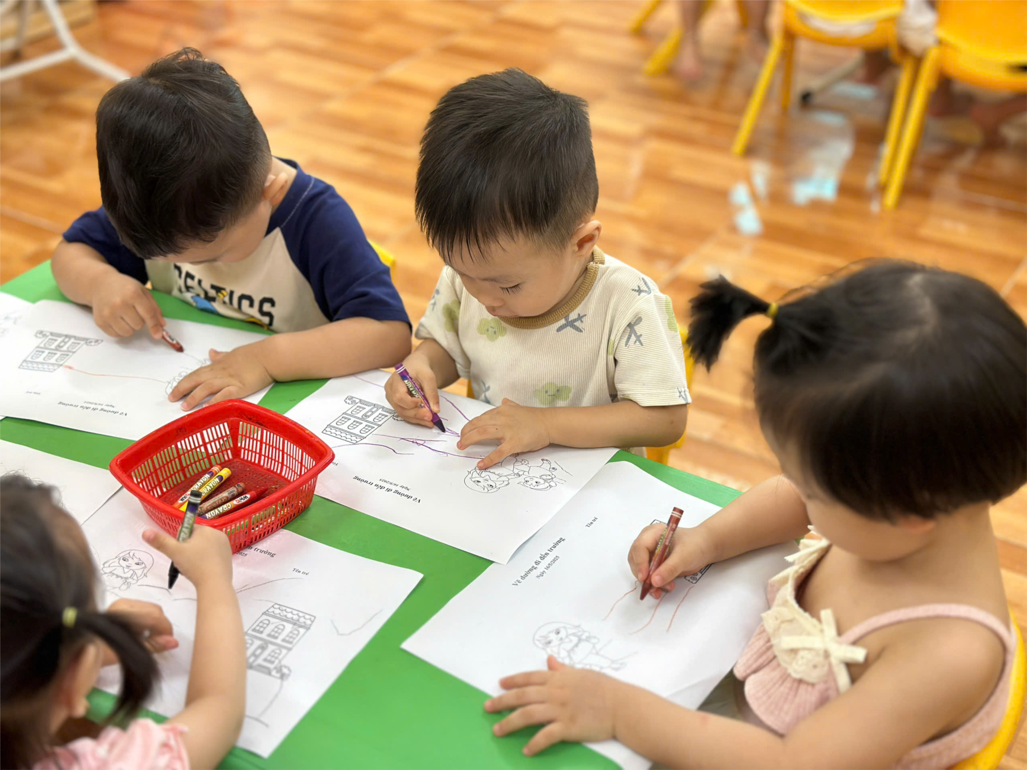Thông qua hoạt động, các con không chỉ học cách cầm bút đúng, phối hợp tay – mắt linh hoạt, mà còn được phát triển ngôn ngữ khi kể lại câu chuyện của riêng mình về bức tranh đã vẽ. Mỗi bức tranh là một thế giới nhỏ đầy màu sắc, thể hiện tình cảm yêu thương, niềm vui và sự gắn bó của các bé với ngôi trường thân yêu.