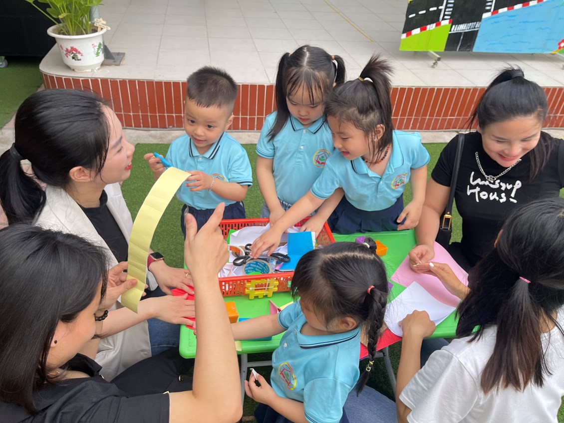 Sáng tạo bức tranh về giao thông từ các nguyên vật liệu của khối 3 tuổi