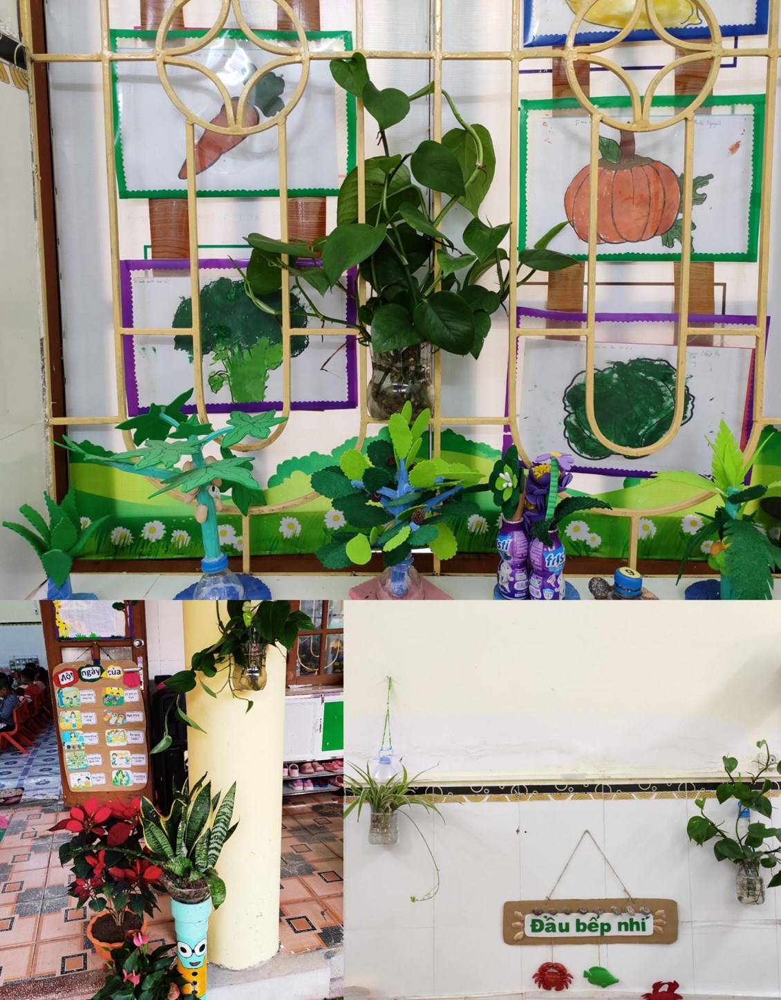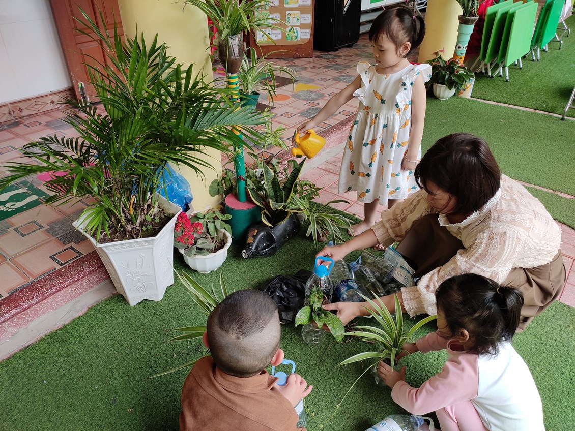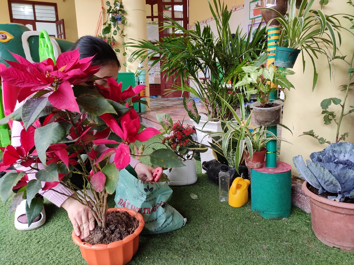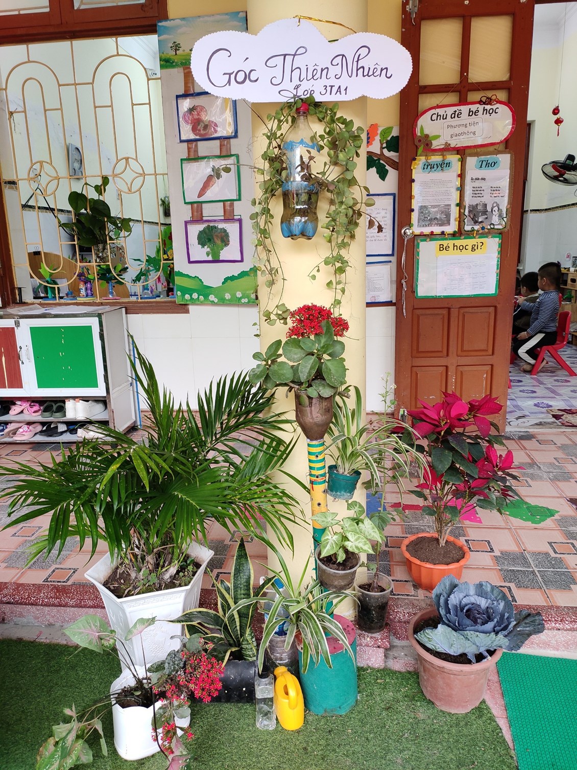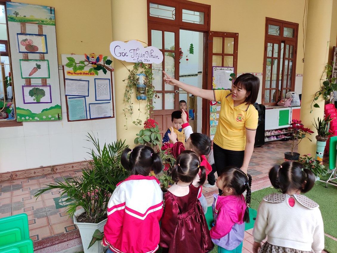 Trong trường mầm non cũng như trong lớp học của các bé không thể thiếu được góc thiên nhiên cho bé chăm sóc, tìm hiểu và khám phá thế giới xung quanh. Các cô giáo đã tạo ra góc thiên nhiên nhỏ bé xinh xắn phù hợp với không gian của lớp mình. Tại đây các bé được tự tay chăm sóc cây, lau lá cây, tưới cây. Qua đó trẻ hiểu được ý nghĩa lợi ích của chúng, giúp trẻ thêm yêu thiên nhiên, gần gũi với thiên nhiên hơn. Những chậu hoa, chậu cây xanh bao quanh lớp học tạo nên những màu xanh dịu mát cho các mảng tường, hành lang lớp học.