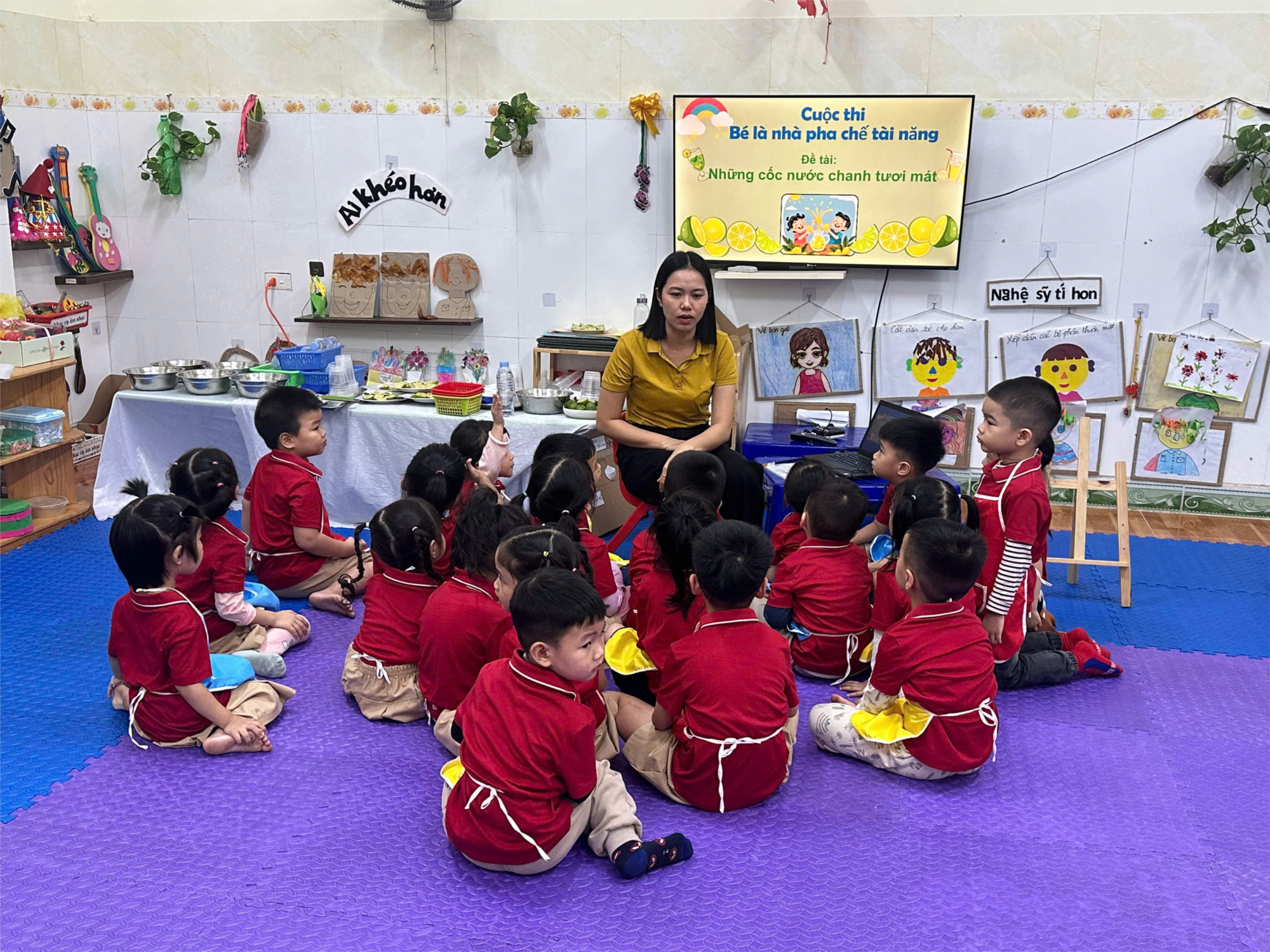 Hòa chung với không khí thi đua của nhà trường, hai cô giáo lớp 4TA1 đã mang đến hai tiết dạy vô cùng hay và sinh động. Cô Hoàng Hoa với tiết day: Bé pha nước chanh và cô Loan với tiết dạy: Bé khám phá quả cam. Các bé đã được các cô mang đến rất nhiều bất ngờ và những điều thú vị trong hai tiết dạy. Chúng mình cùng xem một số hình ảnh của hai tiết dạy nhé.