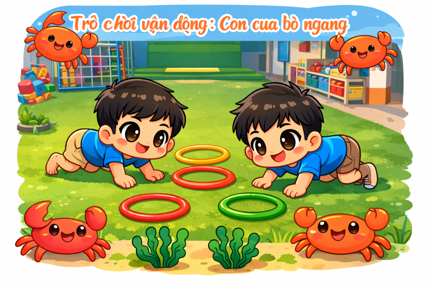Trò chơi "cua bò ngang" cho trẻ mầm non là một hoạt động vận động mô phỏng cách di chuyển của con cua, giúp trẻ rèn luyện sức mạnh cơ bắp, sự khéo léo của tay chân, khả năng thăng bằng và phối hợp giữa tay và chân