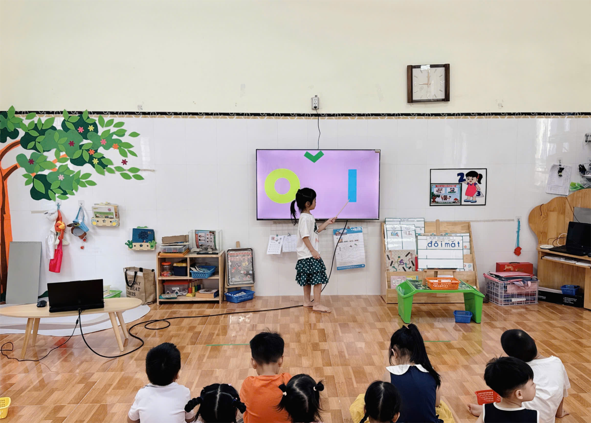 Qua các hoạt động như “Tìm chữ a, ă, â trong từ quen thuộc”, “Thi xem ai nhanh hơn”, các bé không chỉ nhận biết được hình dạng và cách phát âm của các chữ cái a, ă, â mà còn rèn luyện khả năng ghi nhớ, chú ý và phát triển ngôn ngữ mạch lạc. Tiếng cười giòn tan, những ánh mắt say mê đã khiến không khí lớp học thêm phần sôi nổi và gần gũi.