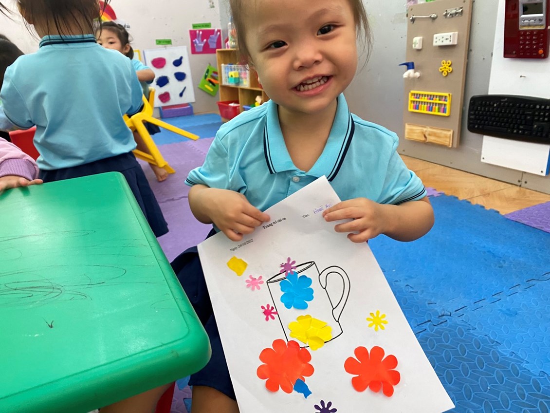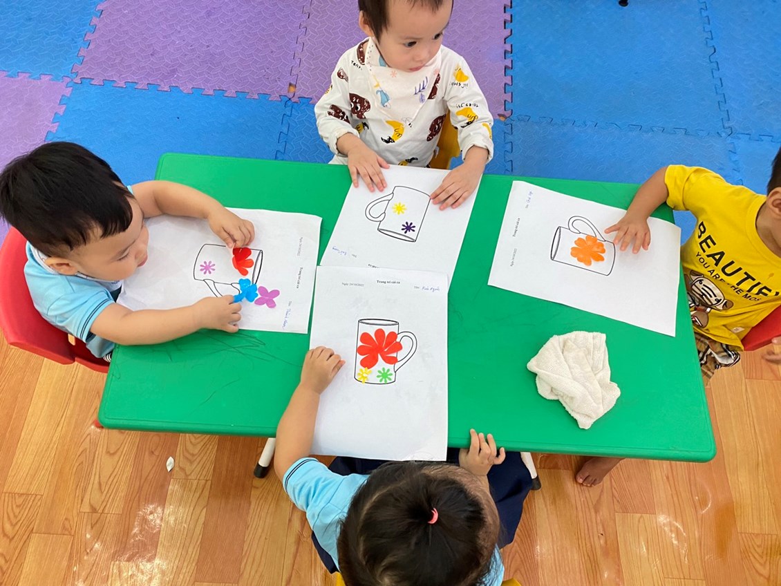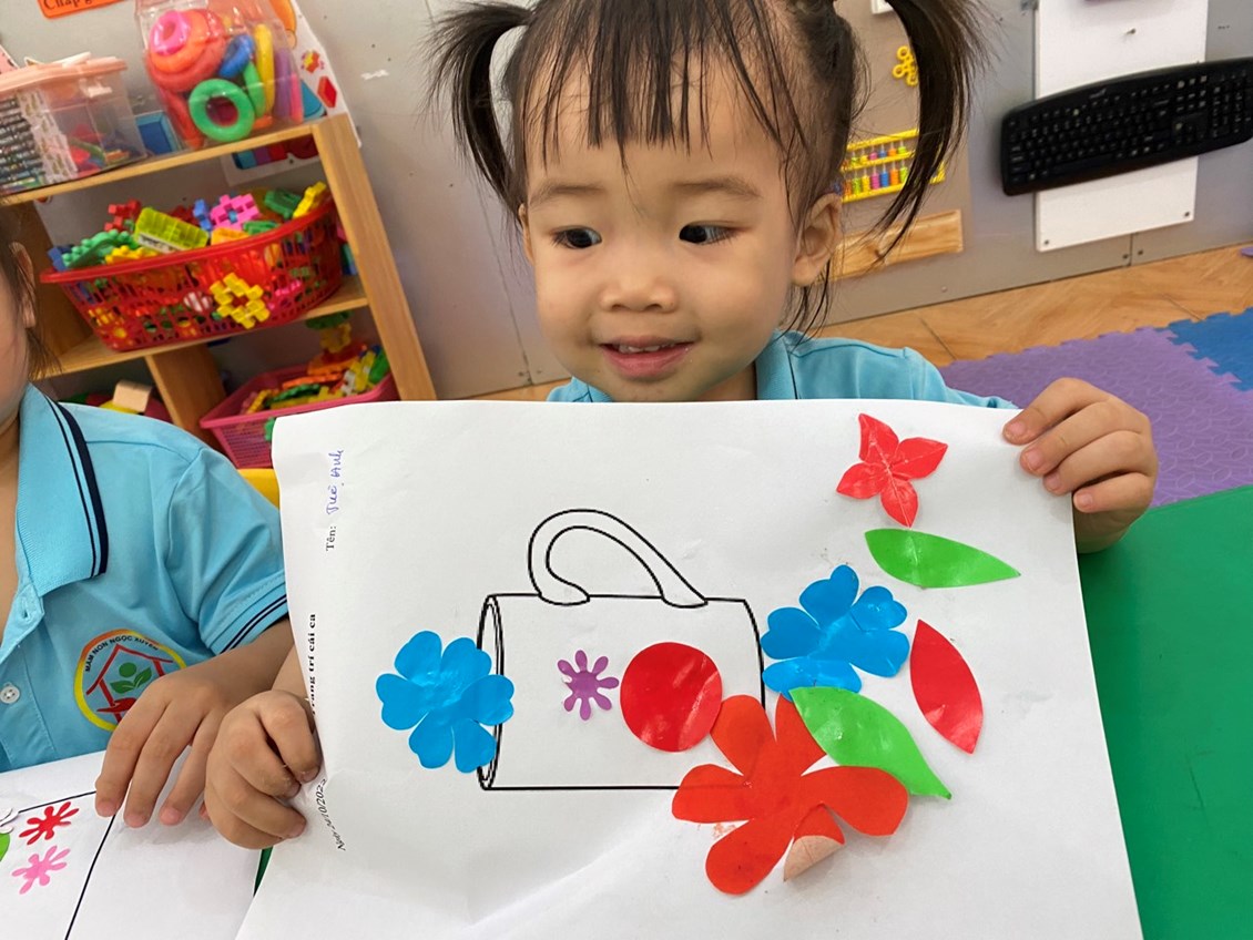 Thật thú vị khi hôm nay các bạn ấy được tự tay cầm những bông hoa nhỏ nhắn và trang trí cái ca xinh xắn của mình. Tất cả đều rất háo hức và hăng say khi thực hiện hoạt động này.