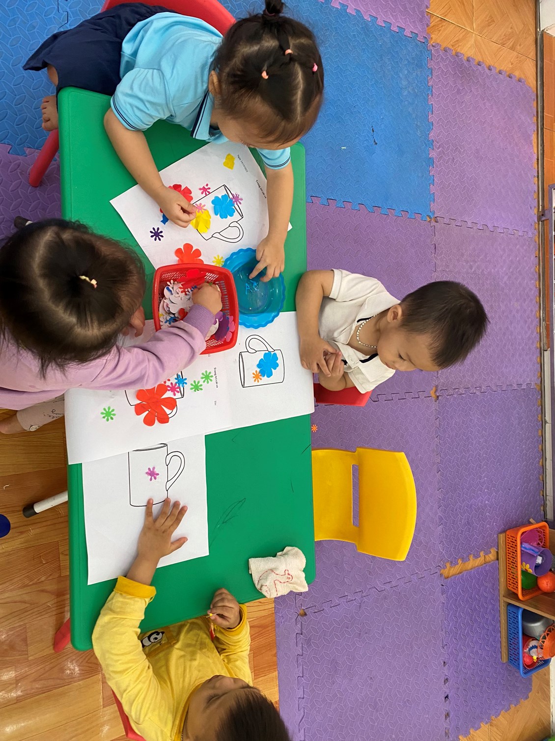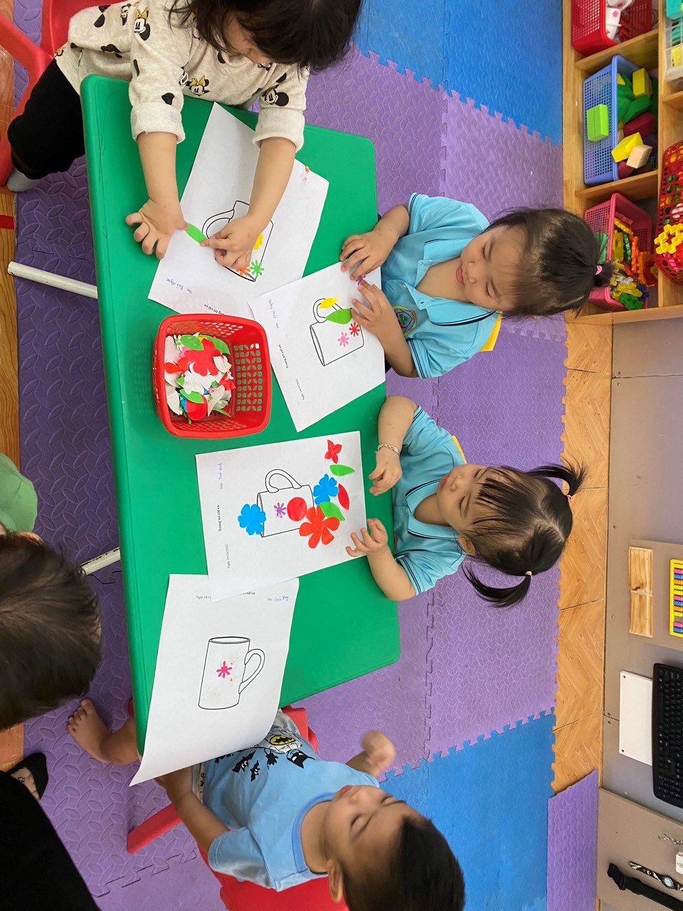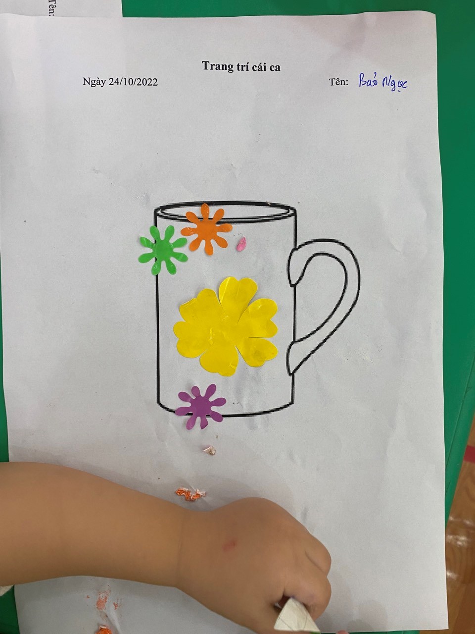 Thật thú vị khi hôm nay các bạn ấy được tự tay cầm những bông hoa nhỏ nhắn và trang trí cái ca xinh xắn của mình. Tất cả đều rất háo hức và hăng say khi thực hiện hoạt động này.
