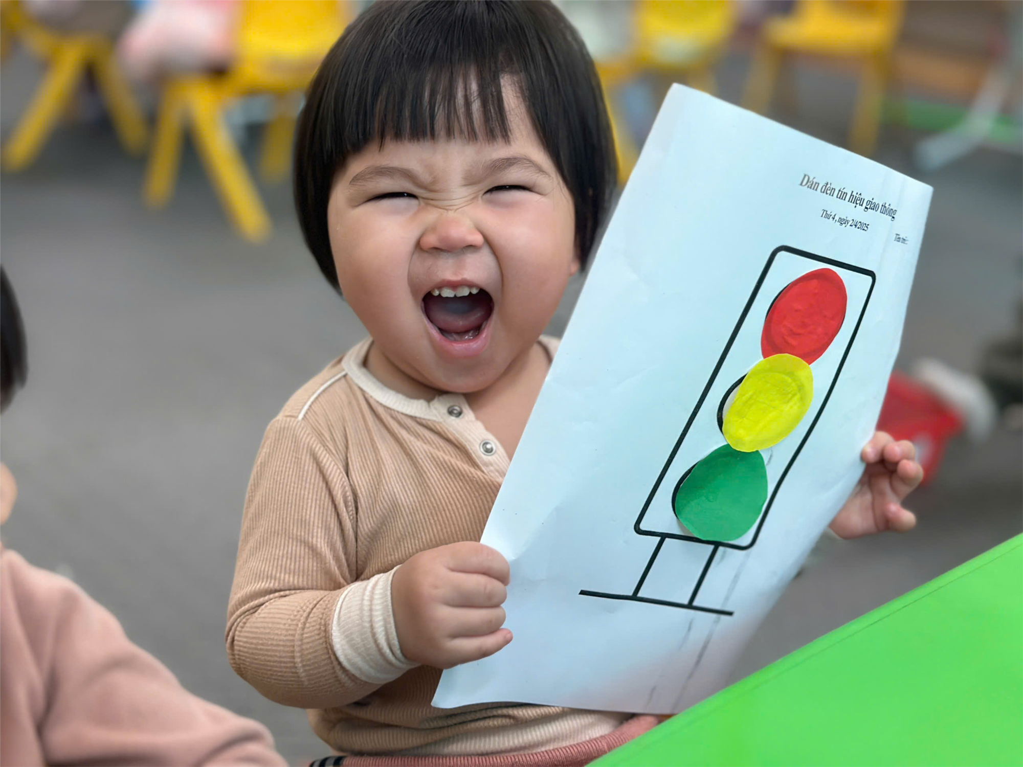 Hôm nay, các bé lớp nhà trẻ A2 đã có một tiết học vô cùng thú vị và bổ ích: Dán đèn tín hiệu giao thông. Đây là một hoạt động vừa giúp các con rèn luyện kỹ năng khéo léo, vừa giúp làm quen với những quy tắc giao thông cơ bản. Các bé rất thích thú khi xem hình ảnh và video về đèn giao thông và nhận ra ba màu sắc quen thuộc "đỏ, vàng, xanh" những lần đi trên đường phố cùng bố mẹ.