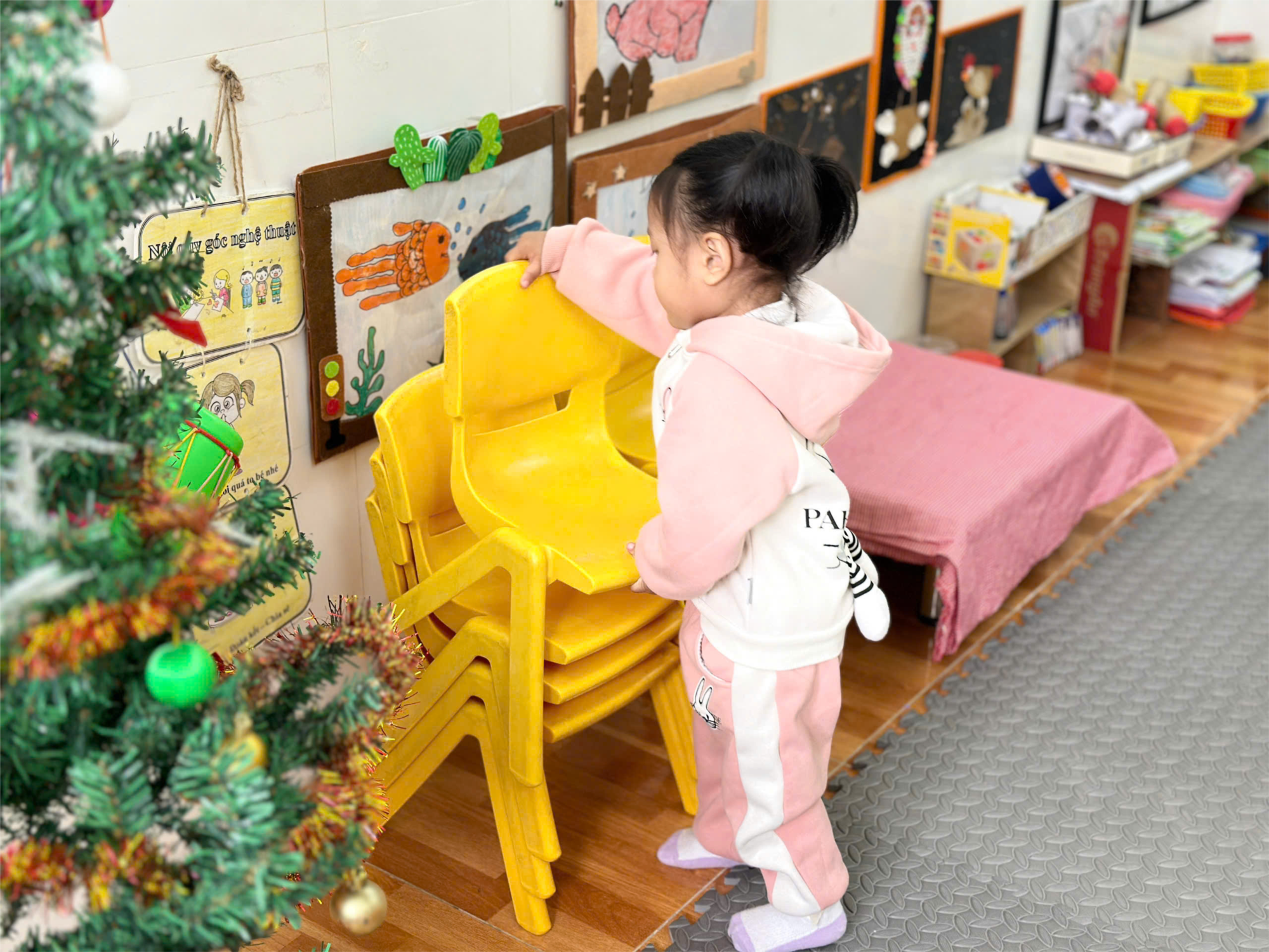 Thông qua những nhiệm vụ nhỏ như bê ghế, trẻ dần hình thành thói quen tự mình làm việc và chủ động trong các hoạt động.