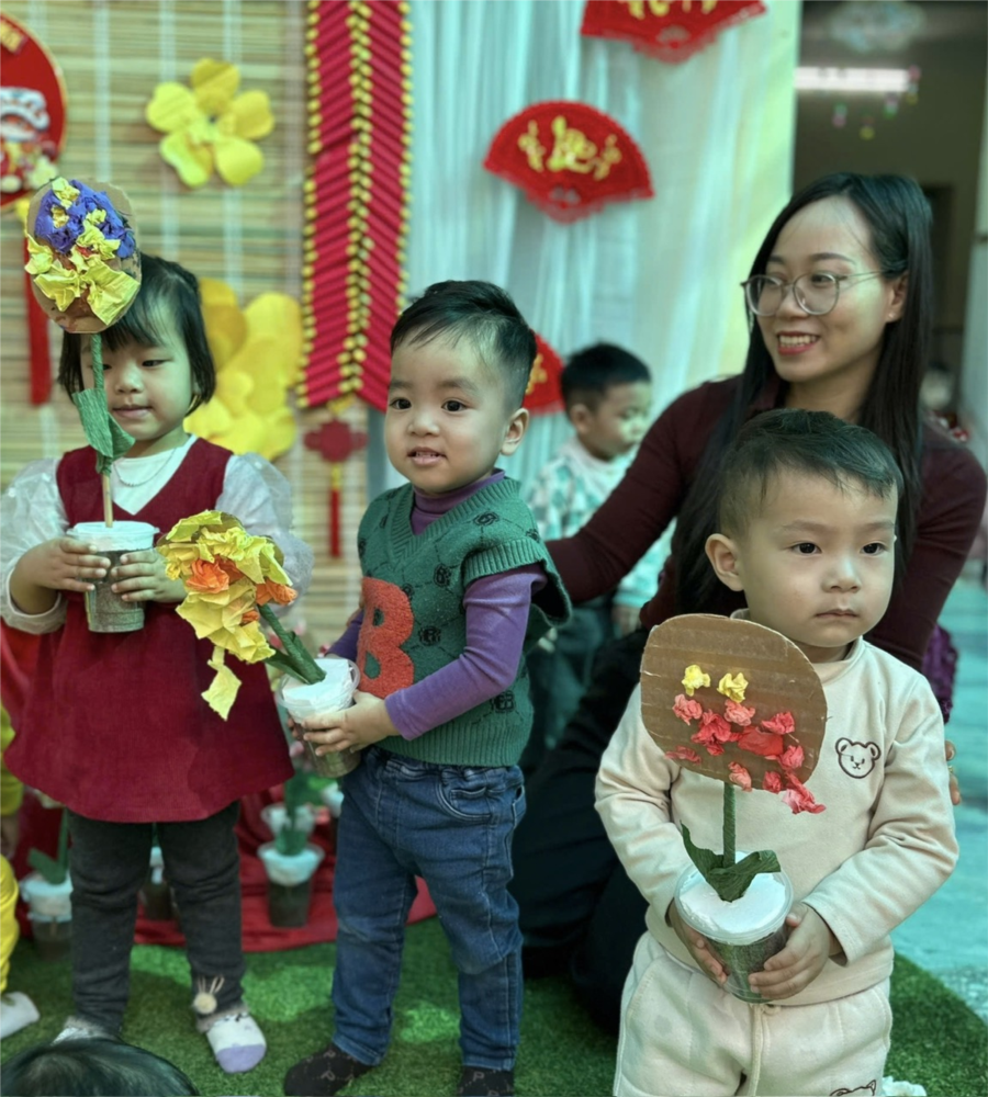 Tết Nguyên Đán là dịp lễ lớn nhất trong năm của người Việt, không chỉ là thời điểm để sum họp gia đình mà còn là cơ hội để mọi người sáng tạo, làm đẹp không gian sống và lan tỏa không khí xuân rộn ràng. Nhằm hưởng ứng Tết và khơi dậy tinh thần sáng tạo, hoạt động “Tạo hoa bằng giấy màu và tăm bông” đã mang lại một trải nghiệm thú vị, bổ ích và tràn đầy sắc xuân cho các bé