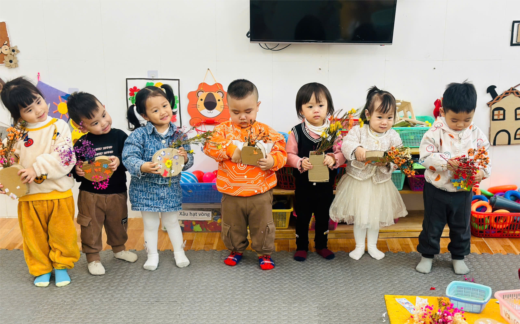 Mỗi bé đều có một lọ hoa xinh xắn dành tặng mẹ. Các bé rất vui vì đã tự tay làm món quà ý nghĩa. Đây không chỉ là món quà nhỏ mà còn là tình yêu lớn bé dành cho mẹ. Cô giáo chụp ảnh lại khoảnh khắc này để lưu giữ kỷ niệm đẹp của bé và lớp học.
