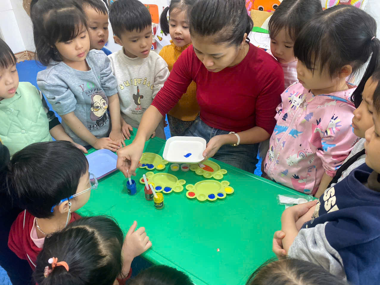 Với trẻ mầm non nhất là trẻ mẫu giáo nhỡ, được vui chơi nhận biết về các màu sắc cơ bản như màu xanh, màu đỏ, màu vàng từ các đồ chơi hàng ngày luôn là điều trẻ vui thích. Tuy nhiên được vui chơi với màu nước, được khám phá và trải nghiệm thực hành việc pha màu từ các màu cơ bản thành nhiều màu khác nhau thì trẻ lại càng hứng thú. Các cô giáo lớp 4TA2 đã tổ chức cho các con được vui chơi, trải nghiệm pha màu nước. Trẻ rất vui thích và hào hứng tham gia.
