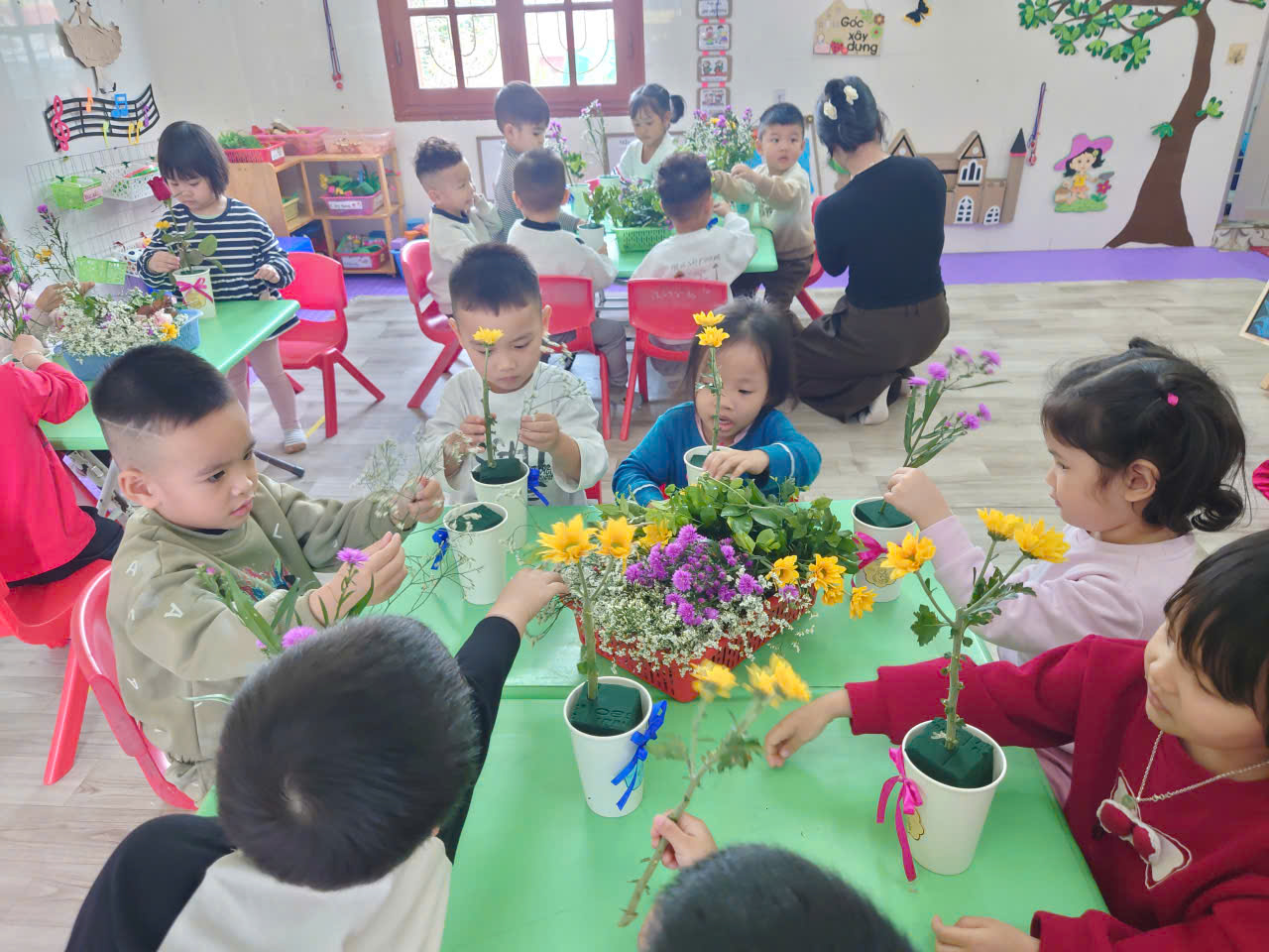 Cô giáo nhẹ nhàng cắm những bông hoa cho trẻ cùng xem
