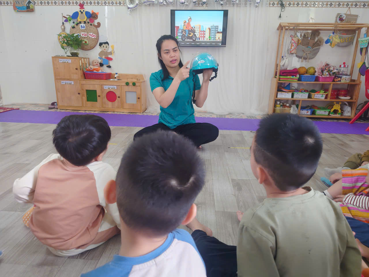 Các bé được cô giới thiệu về đặc điểm của chiếc mũ bảo hiểm