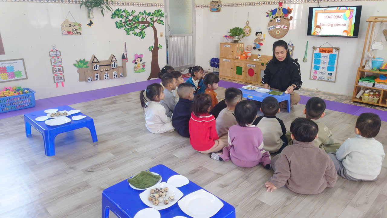 Cô giáo giới thiệu những quả trứng cho trẻ quan sát