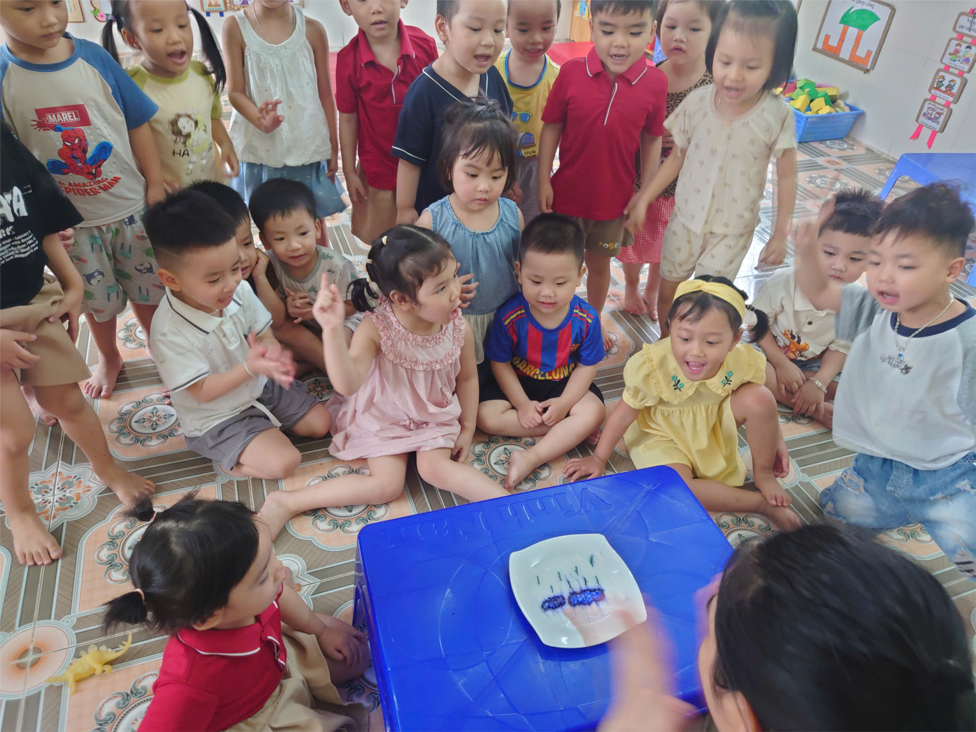Các bé ngắm nhìn từng vệt màu lan tỏa trong nước, tay cầm chạm nhẹ vào giấy ăn, không ngừng hỏi: "Tại sao vậy cô? Tại sao hình mình vẽ lại xuất hiện nhỉ?" Cô giáo vui vẻ giải thích: "Đây là phép màu của nước thấm vào giấy ăn, và màu bút dạ di chuyển theo từng sợi nước nha các bé!"