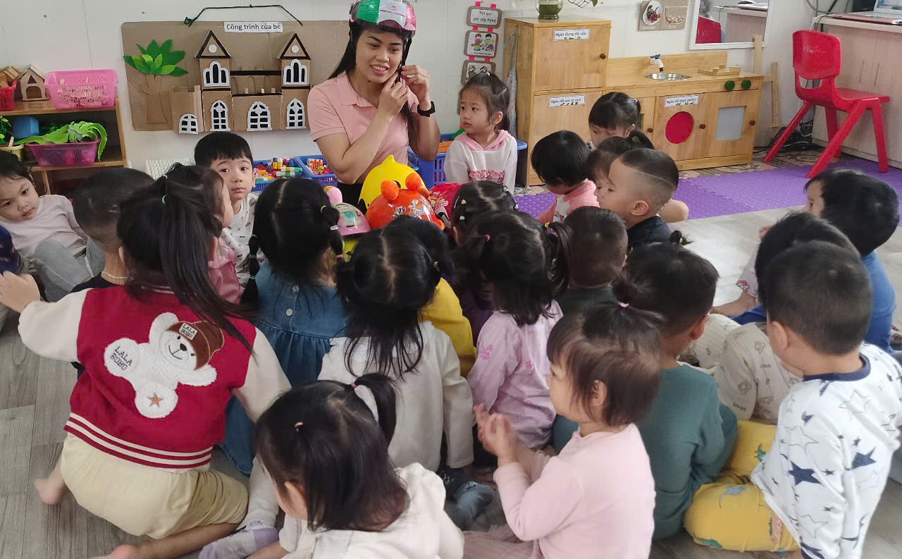 Cô giáo giới thiệu cho trẻ biết về chiếc mũ bảo hiểm