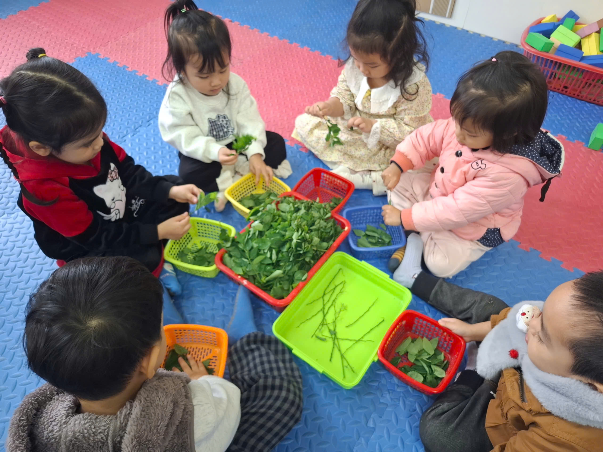 Trong chủ đề Thực vật, lớp 3 tuổi A2 đã có một tiết học trải nghiệm vô cùng đáng yêu với hoạt động nhặt rau ngót. Không cần đi chợ, không cần vào bếp, chỉ cần một rổ rau xanh là cả lớp đã có ngay một buổi học rộn ràng tiếng cười.