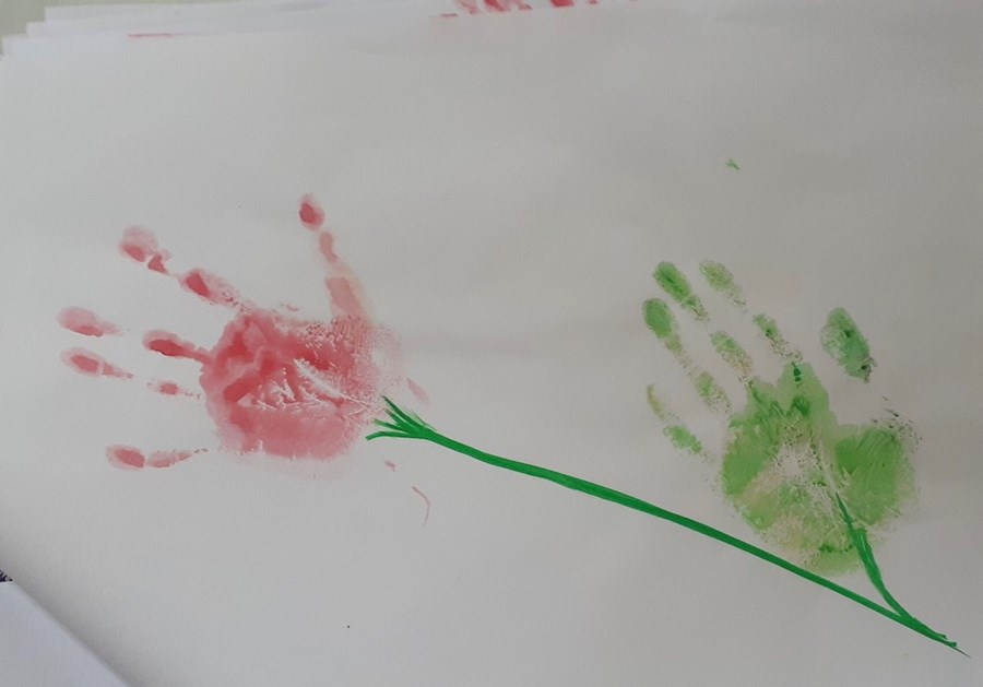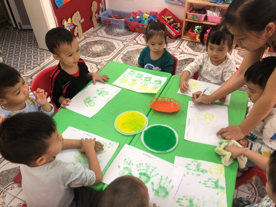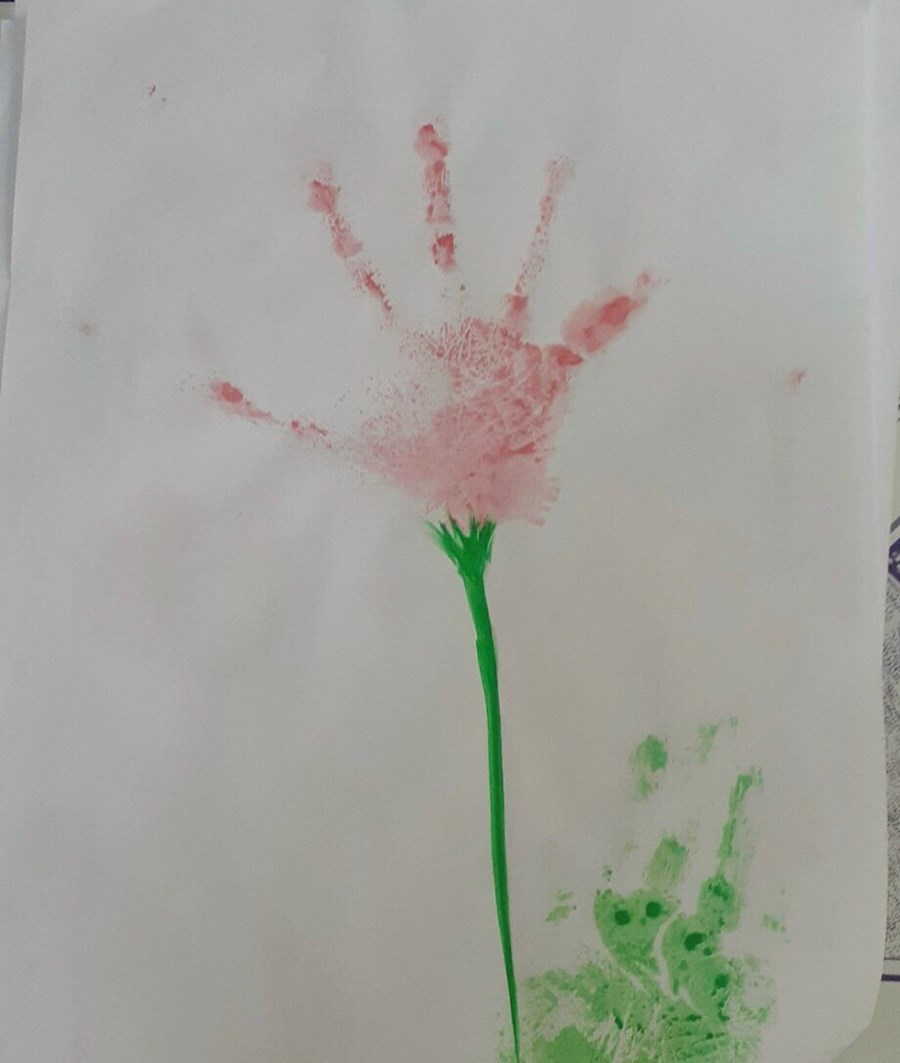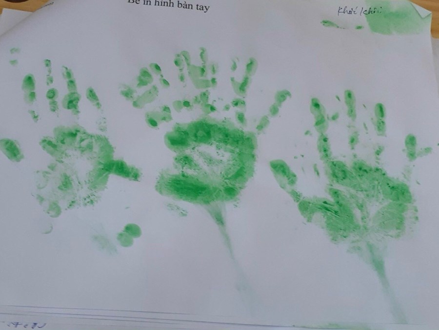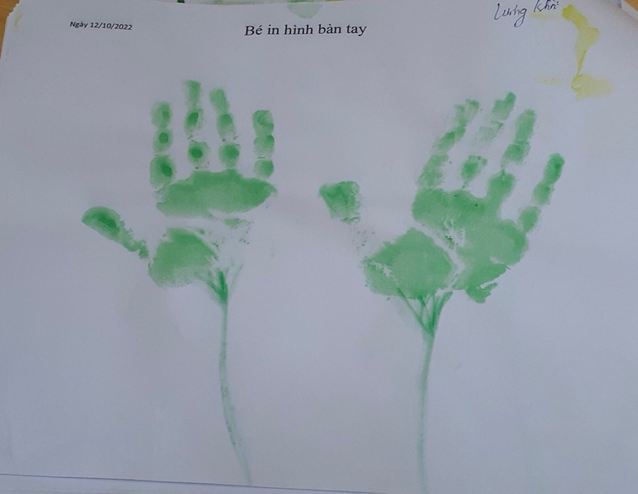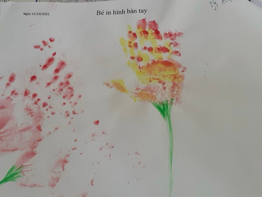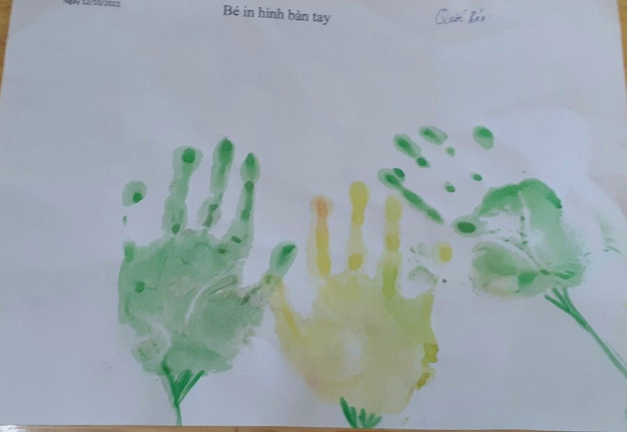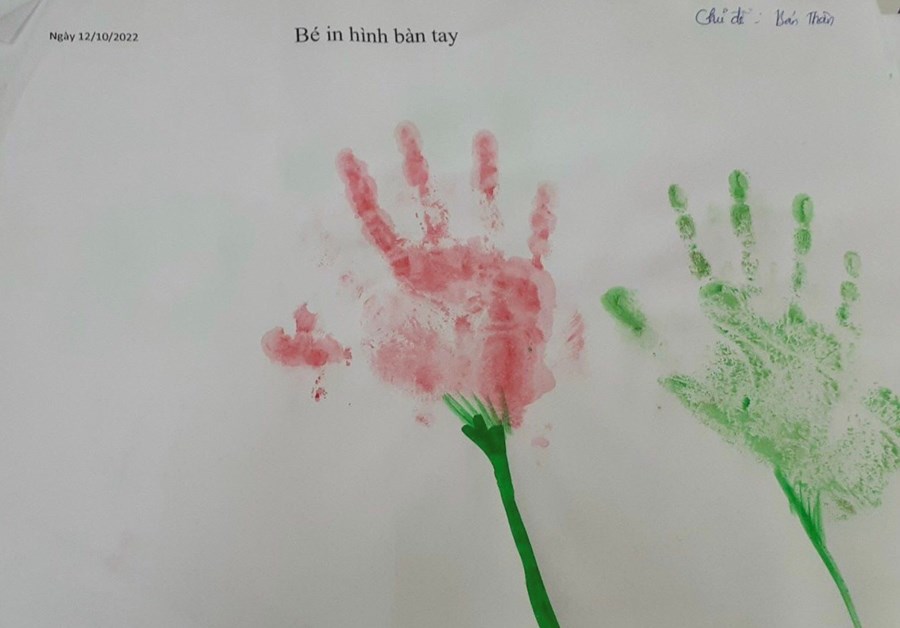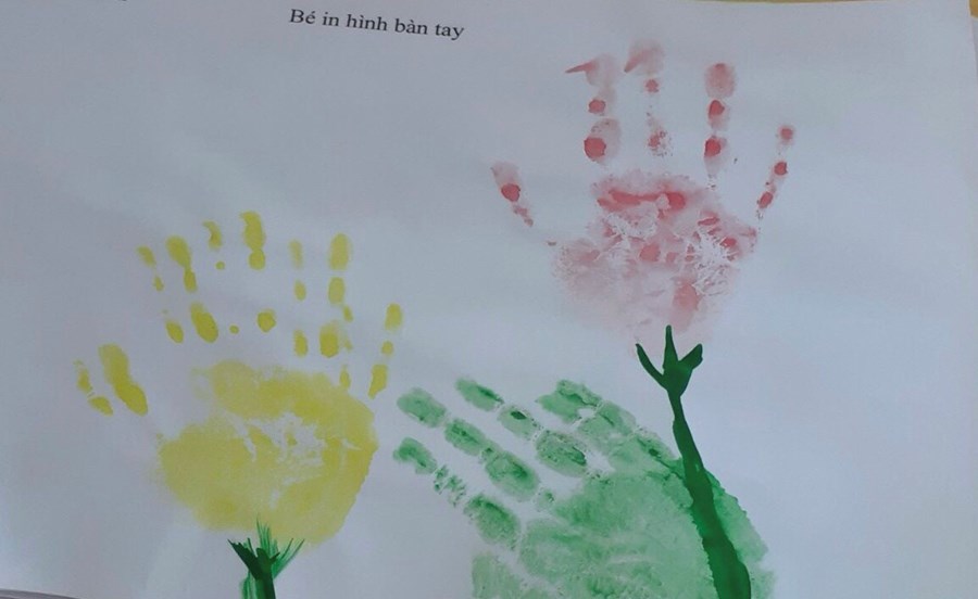 In lên giấy trông thật mê. Như bông hoa ngát trong vườn. Như chiếc lá đón bình minh. Bao cố gắng của em thơ làm lên một bức tranh đẹp. Nghe lời cô em đã in những bàn tay trên giấy trắng như hoạ sĩ vẽ bông hoa.