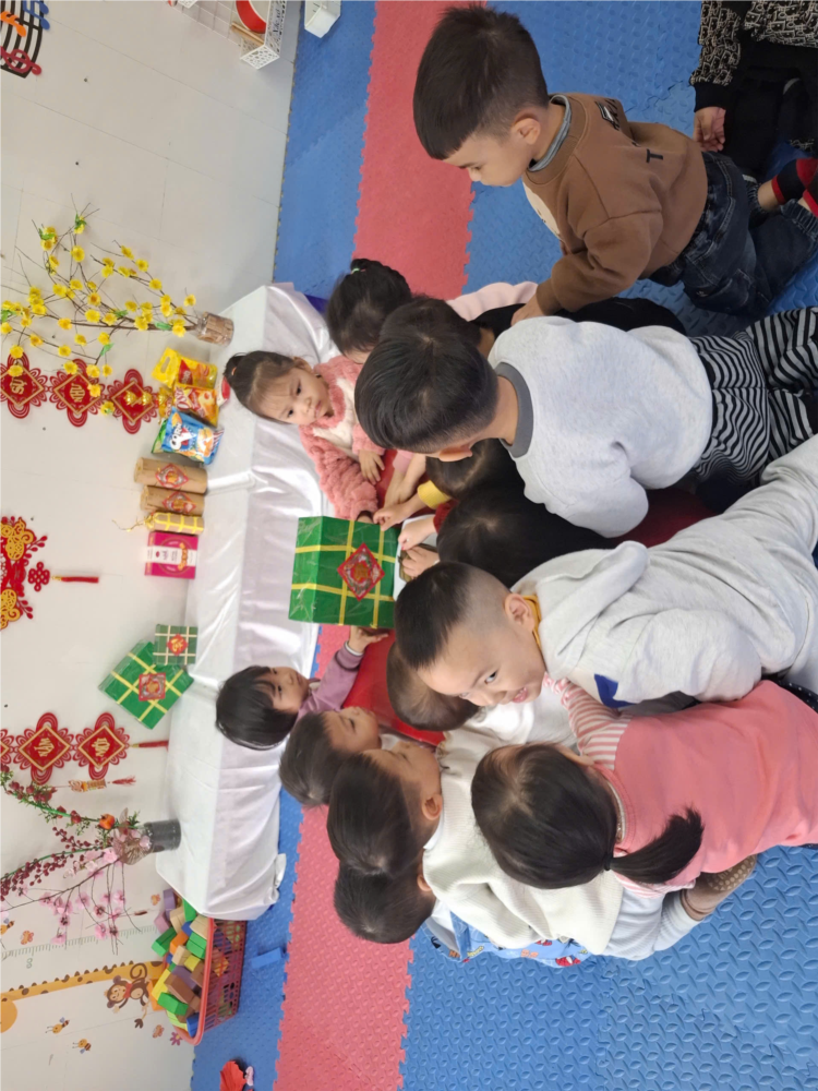 Trong giờ học, các bé được quan sát bánh chưng, tìm hiểu về hình dáng, màu sắc, nguyên liệu và ý nghĩa của món bánh truyền thống trong ngày Tết Việt Nam. Các con hào hứng trò chuyện, đặt câu hỏi và cùng nhau thưởng thức hương vị thơm ngon của bánh chưng.