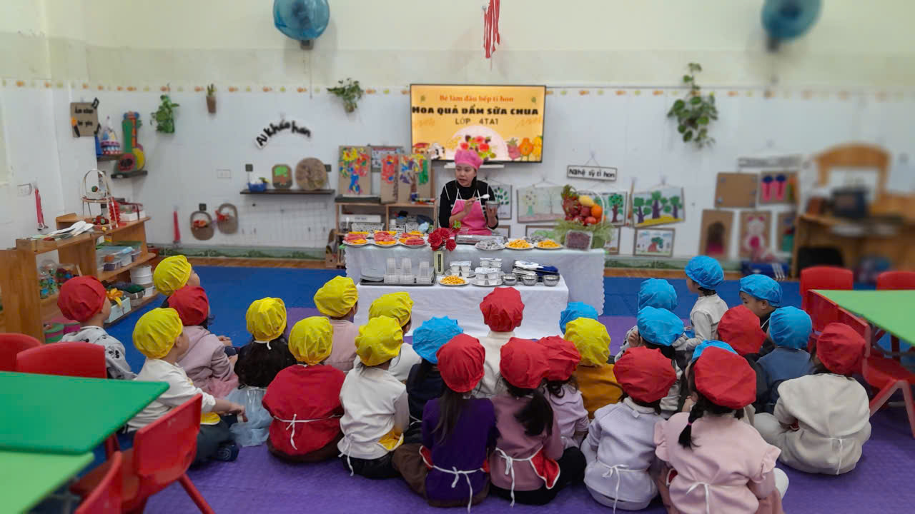 Thông qua hoạt động các bé biết được cách sơ chế các loại hoa quả, đổ sữa chua , sữa đặc vào trộn đều, được rèn luyện sự khéo léo của đôi bàn tay. Hơn nữa, còn giúp các con biết hợp tác, chia sẻ và hiểu biết thêm về những món ăn hằng ngày.