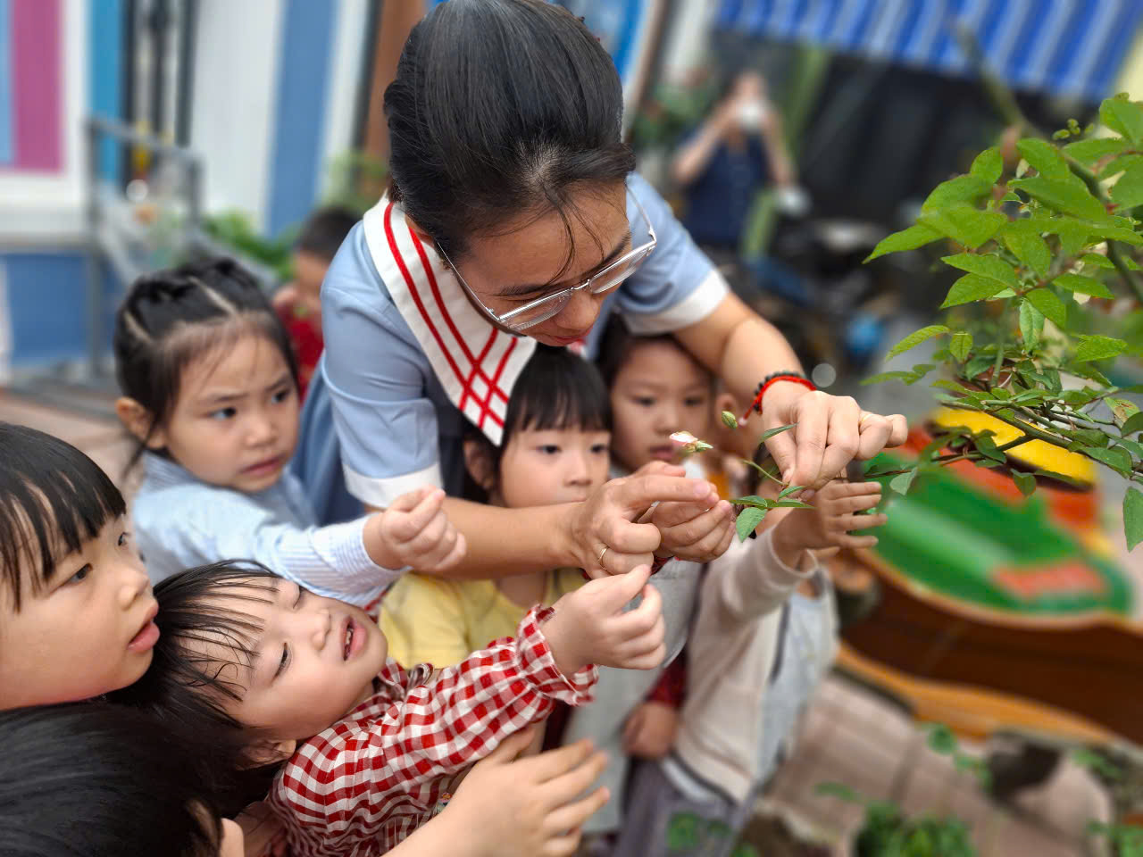 Không chỉ quan sát, các bé còn được trải nghiệm cảm giác chạm vào lá, thân cây và thảo luận về những gì mình nhìn thấy. Có bé còn thắc mắc: "Tại sao cây hoa hồng lại có gai?" Cô giáo đã tận dụng cơ hội này để giúp các bé hiểu rằng gai chính là "lá chắn" giúp hoa hồng tự bảo vệ mình khỏi các loài động vật ăn lá.