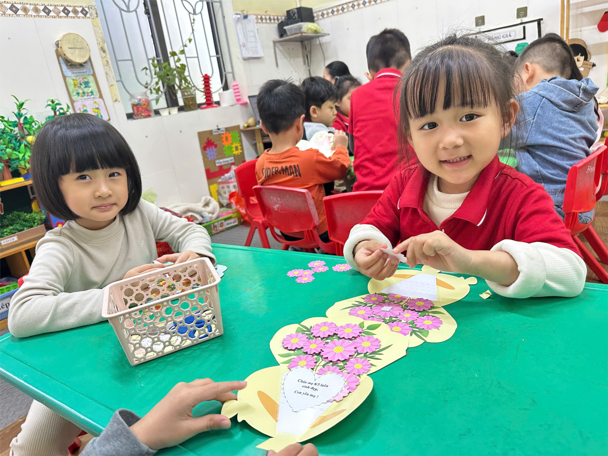 Trong không khí vui tươi và ấm áp, các bé được cô giáo hướng dẫn lựa chọn những bông hoa nhiều màu sắc, nhẹ nhàng bôi hồ gắn băng dính và khéo léo dán lên tấm thiệp xinh xắn. Tuy còn đôi chút vụng về, nhưng từng đôi bàn tay nhỏ bé đã cố gắng thật chăm chú để hoàn thành món quà của mình.