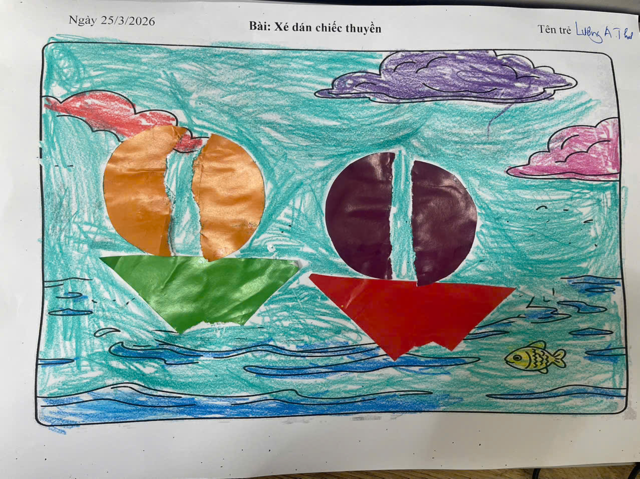 Hình ảnh các bé ngồi ngay ngắn 🪑, chăm chú xé giấy màu thành từng mảnh nhỏ 🎨. Đôi bàn tay bé xinh ✋ thoăn thoắt dán từng chi tiết để tạo nên những chiếc thuyền trên mặt nước ⛵. Khuôn mặt ai cũng rạng rỡ 😊, ánh mắt tập trung 👀, thể hiện sự say mê và thích thú trong từng sản phẩm của mình 💕.