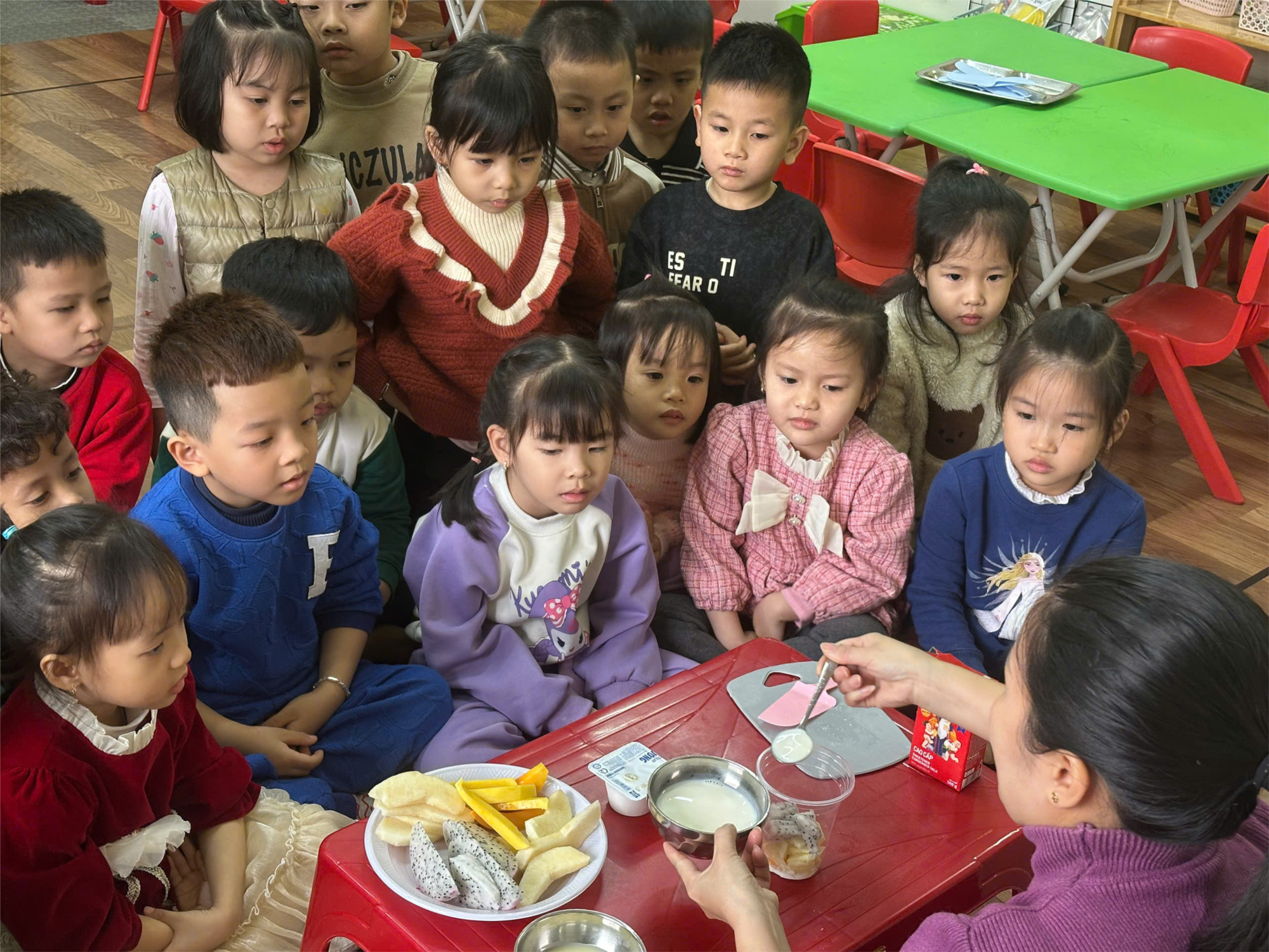 Khoảnh khắc thú vị nhất là khi các bé tự trang trí cốc sữa chua của mình với nhiều màu sắc rực rỡ từ các loại quả khác nhau. Ai cũng vui vẻ và háo hức thưởng thức thành quả của mình. Những nụ cười tươi rói, ánh mắt lấp lánh niềm vui khiến tiết học trở nên ý nghĩa hơn bao giờ hết.