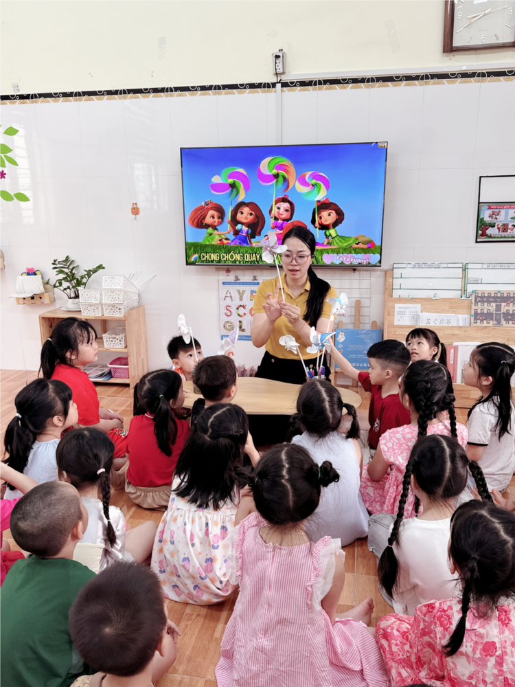Khi những chiếc chong chóng hoàn thành, các bé cùng nhau chạy ra sân, giơ cao “thành quả” của mình và reo lên vui sướng khi thấy chong chóng quay tròn trong gió. Sân trường như rực rỡ hơn với đủ sắc màu xoay tít, mang theo tiếng cười giòn tan của các con.