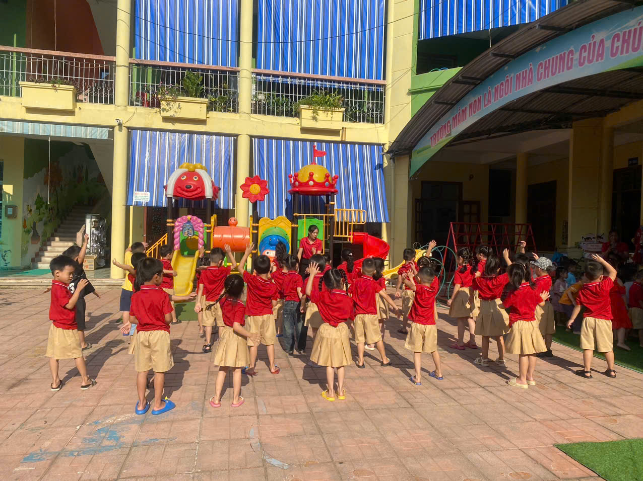 Vào mỗi buổi sáng, tất cả các bé lại háo hức và mong chờ đến hoạt động thể dục sáng. Các bé được các cô đưa ra sân tập thể dục buổi sáng trong tiếng nhạc rộn ràng. Khi tiếng nhạc vang lên bé nào cũng nhanh nhẹn chuẩn bị đồ dùng để ra tập thể dục.