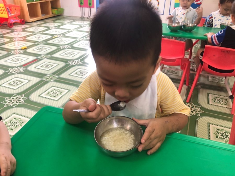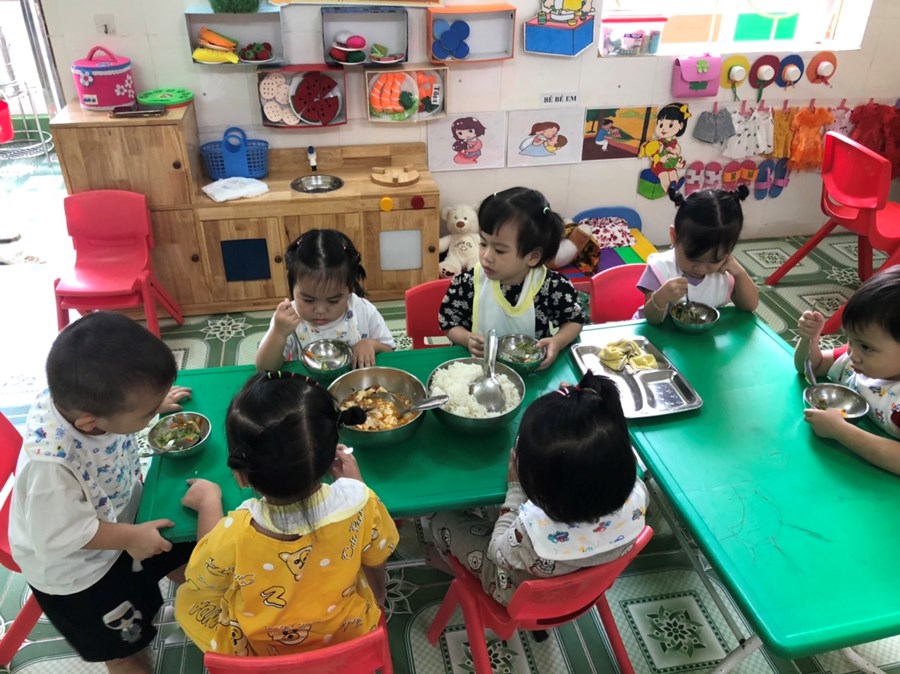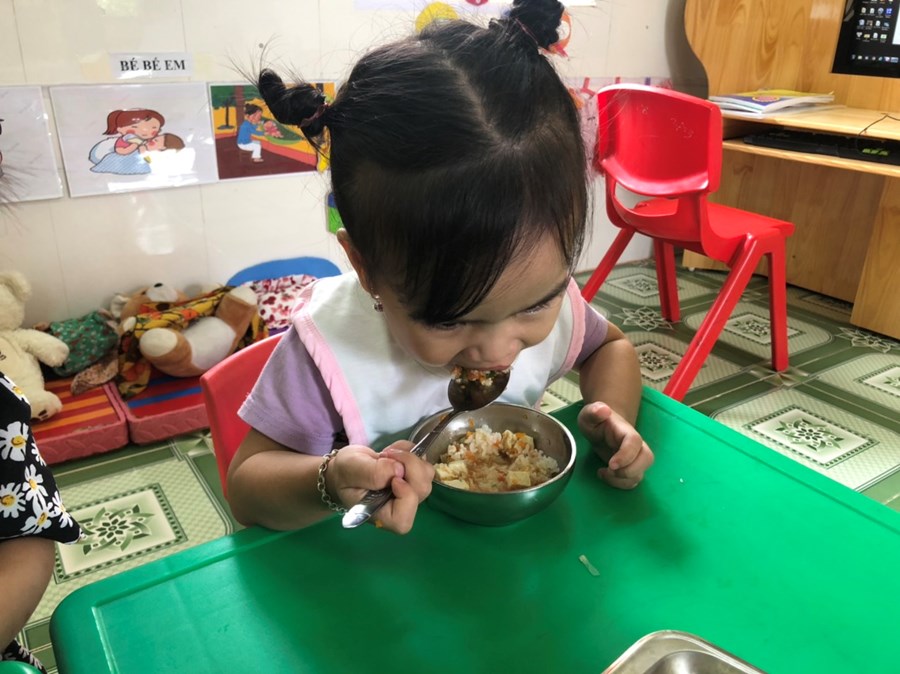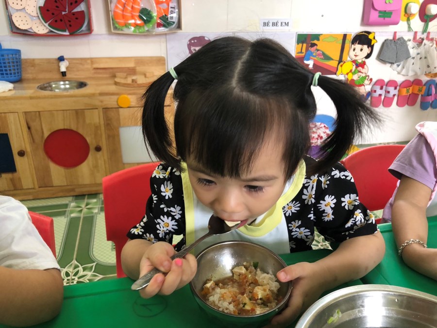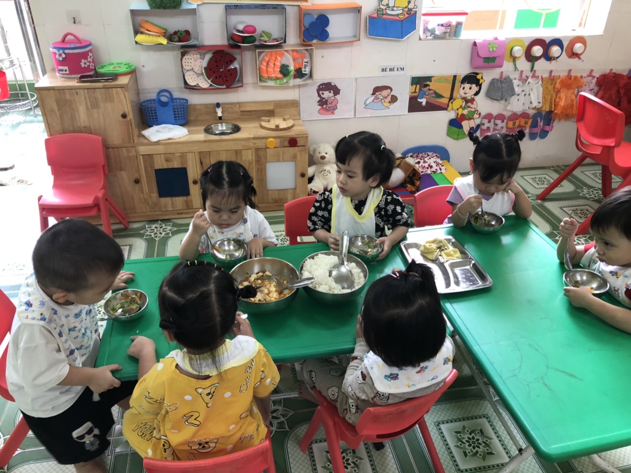 Bố mẹ ơi! Đến trường con được ăn nhiều món ăn ngon lắm! Con còn biết ăn rau nữa nè. Con tự xúc cơm ăn đó không cần ai xúc đâu. Con còn biết rửa tay sạch sẽ trước khi ăn, và lau miệng xinh sau khi ăn cơm đó. Bố mẹ thấy con có giỏi không? Bố mẹ cùng xem giờ ăn của con nhé.