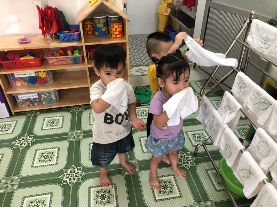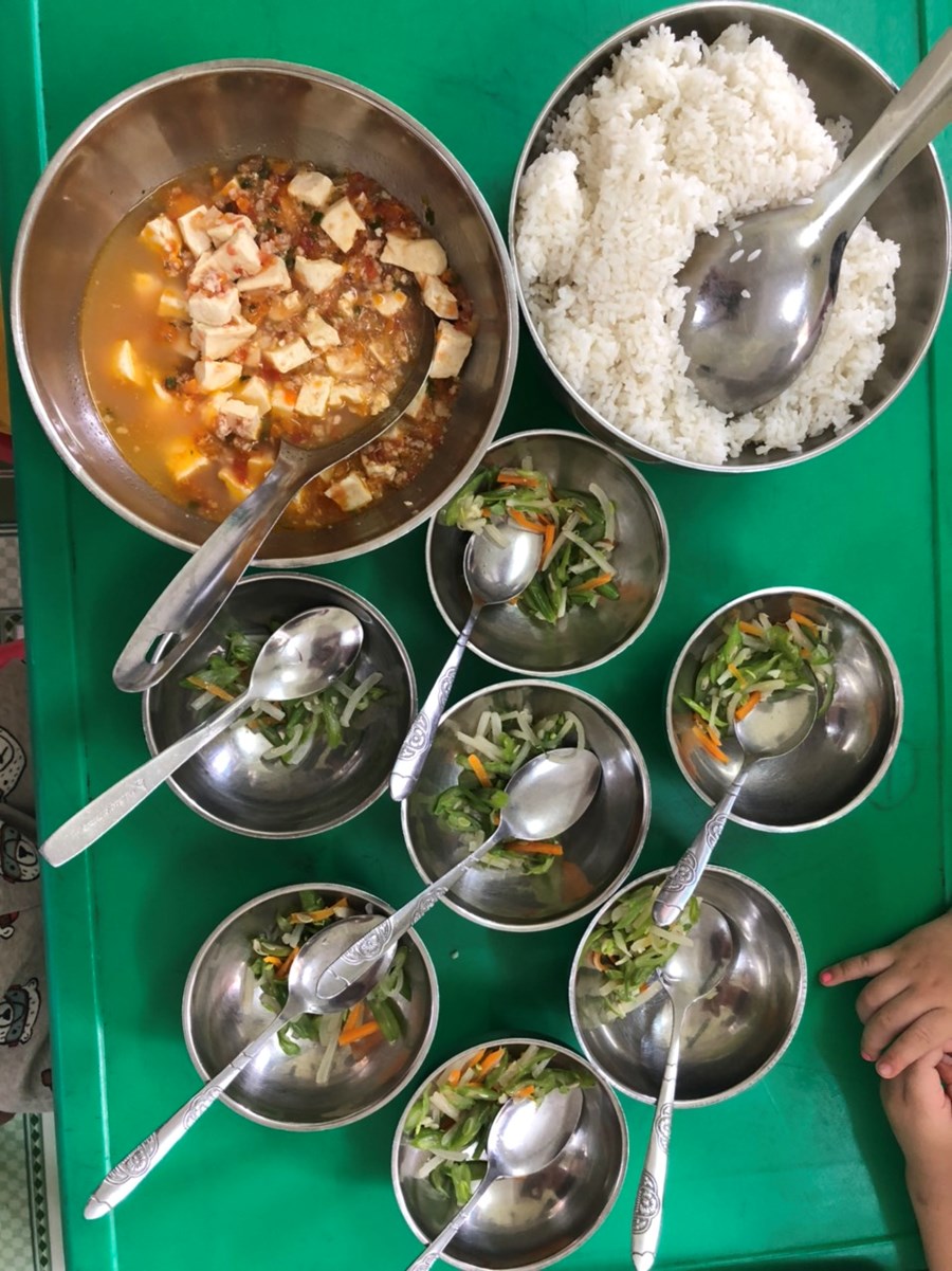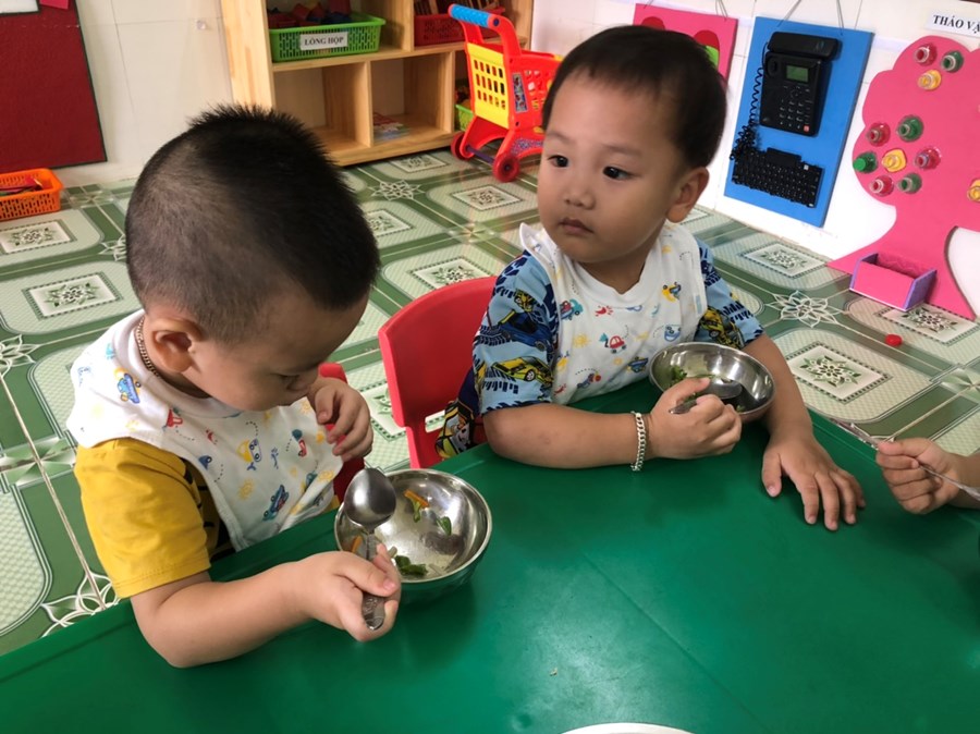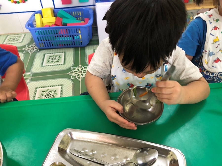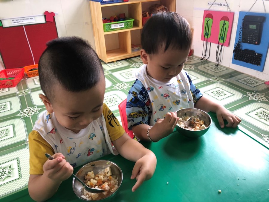Bố mẹ ơi! Đến trường con được ăn nhiều món ăn ngon lắm! Con còn biết ăn rau nữa nè. Con tự xúc cơm ăn đó không cần ai xúc đâu. Con còn biết rửa tay sạch sẽ trước khi ăn, và lau miệng xinh sau khi ăn cơm đó. Bố mẹ thấy con có giỏi không? Bố mẹ cùng xem giờ ăn của con nhé.